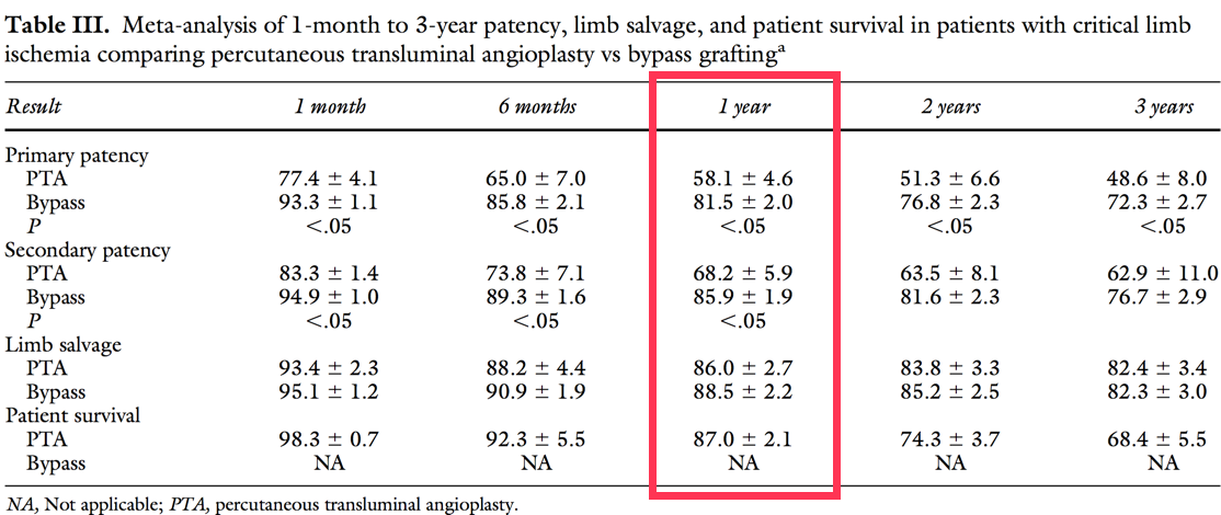 Romiti, M., Albers, M., Brochado-Neto, F. C., Durazzo, A. E. S., Pereira, C. A. B., & De Luccia, N. (2008). Meta-analysis of infrapopliteal angioplasty for chronic critical limb ischemia. Journal of vascular surgery, 47(5), 975-981.